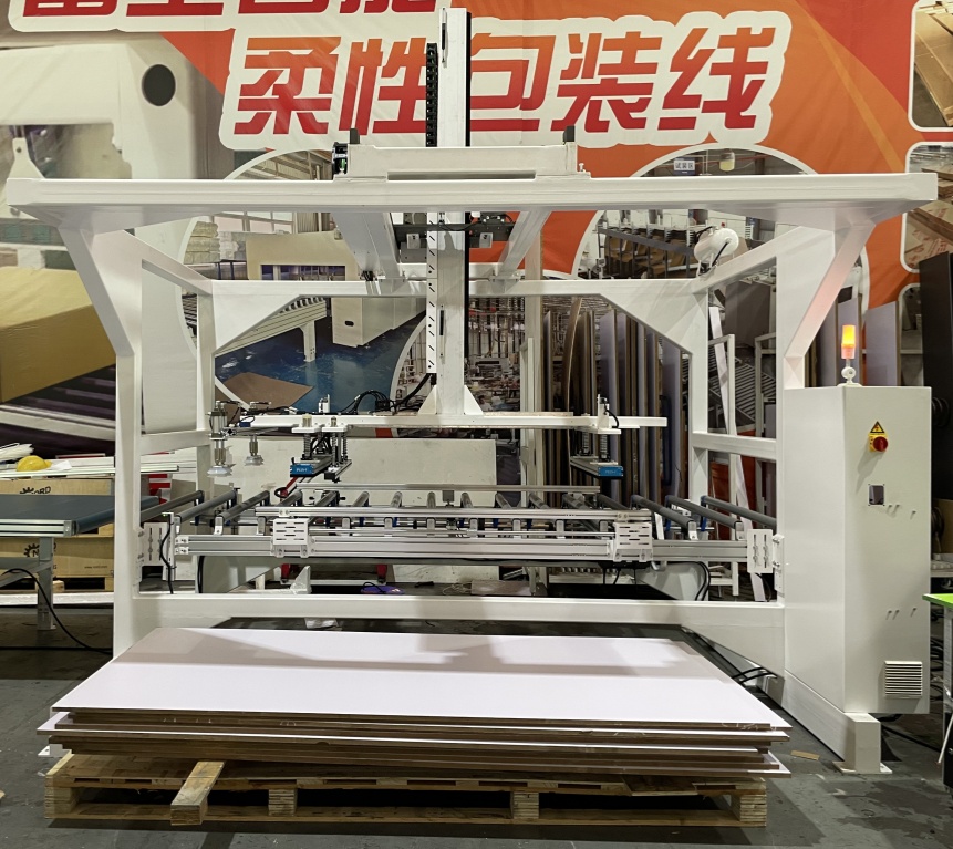 1. Подготовка на оптоварување: Работниците поставуваат цели палети на панели засновани на дрво што се обработуваат на решетката за хранење на опремата. Платформата за кревање на решетката автоматски се прилагодува на почетната висина на грабање.